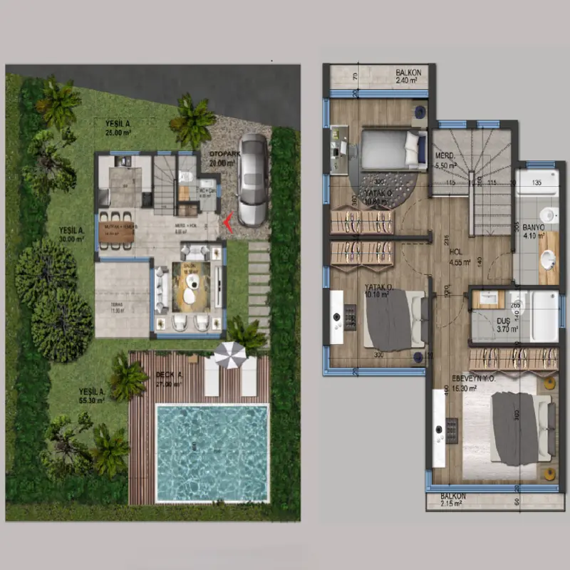 - فلل 3+1: بمساحات رحبة تتراوح بين 315 و 345 متر مربع، بتشطيبات فاخرة ومساحات داخلية فسيحة.