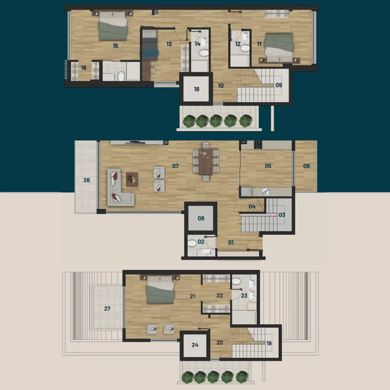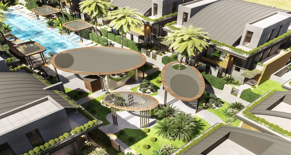 - حمام سباحة مشترك ومصمم خصيصًا مع تراسات للحمامات الشمسية