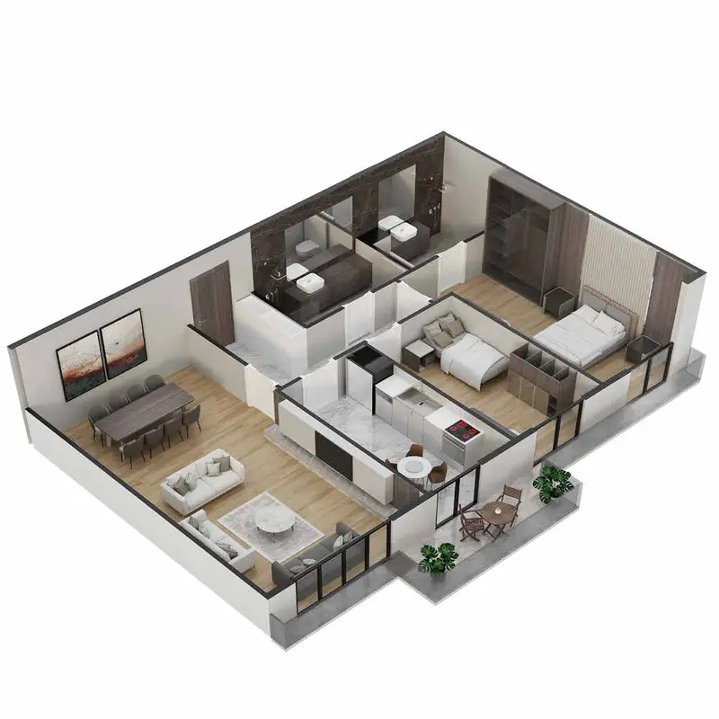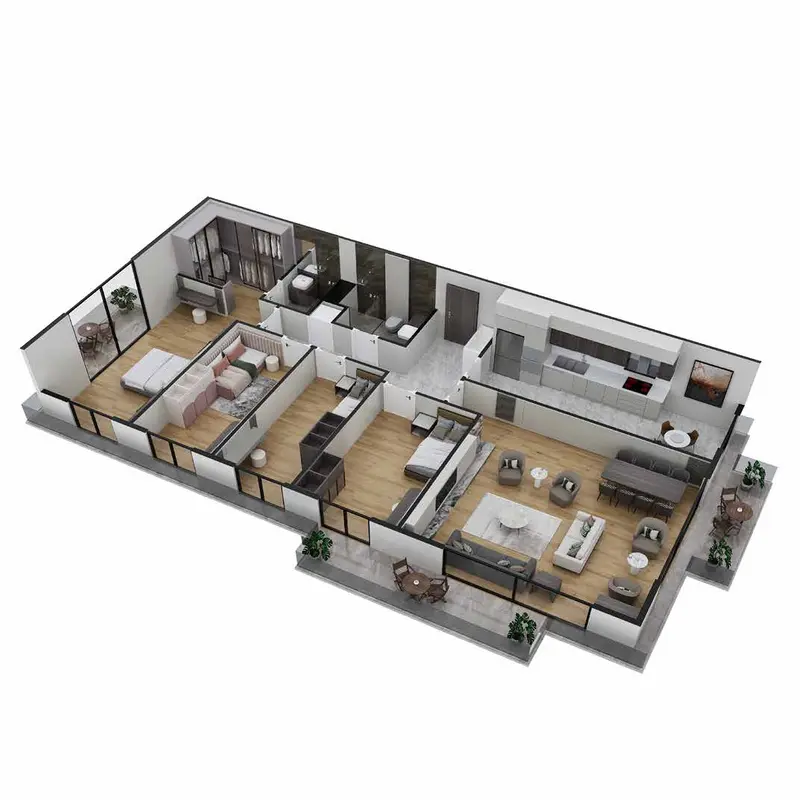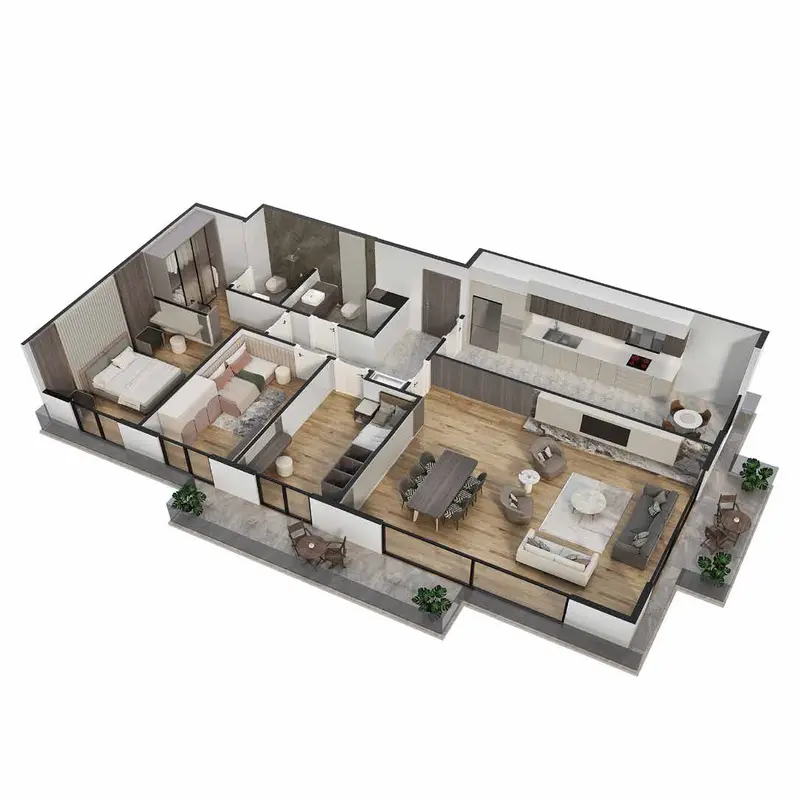 • The project's buildings include residential apartments with modern designs and high-quality finishes.