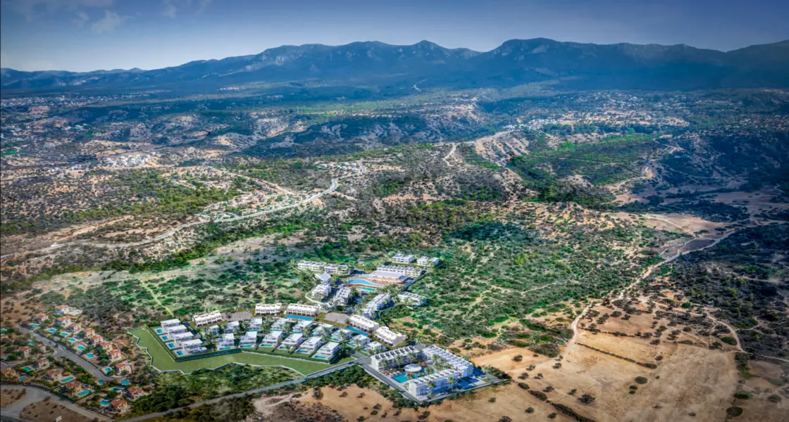 This luxurious residential resort, strategically located in Kyrenia, Northern Cyprus, presents an exceptional opportunity for both living and investment. The resort boasts a unique location that combines the charm of stunning natural beauty and the fresh air emanating from the green mountains, with the beauty of ancient olive trees and the allure of the turquoise Mediterranean bays, allowing residents to experience a complete sensory experience that reflects the island's renewable energy. The project embodies an integrated architectural vision that blends Cypriot authenticity and ancient Mediterranean heritage with innovative modern touches, creating a unique living environment that reflects the cultural harmony dating back centuries. Spanning an area of 7780 square meters, the project consists of 12 buildings with a height of three floors, comprising 122 diverse residential units catering to various needs and tastes, ranging from practical studios (1+0) to spacious family apartments (2+1), with areas ranging from 38 square meters to 85 square meters, providing multiple options for investors and residents alike.