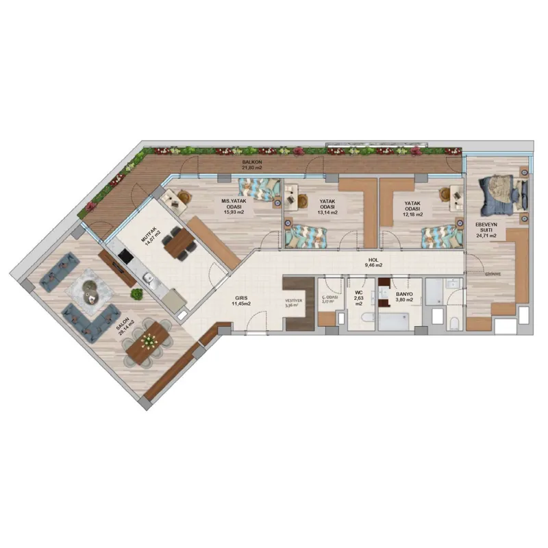 This project was built on a land area of 20,000 square meters and consists of 5 buildings or residential blocks with a height of 12 floors. This project offers 342 residential apartments for sale in Istanbul with styles starting from 2+1 up to 4+1 and areas starting from 108 up to 327 sq. meters. , there are duplex apartments for sale in this project as well.