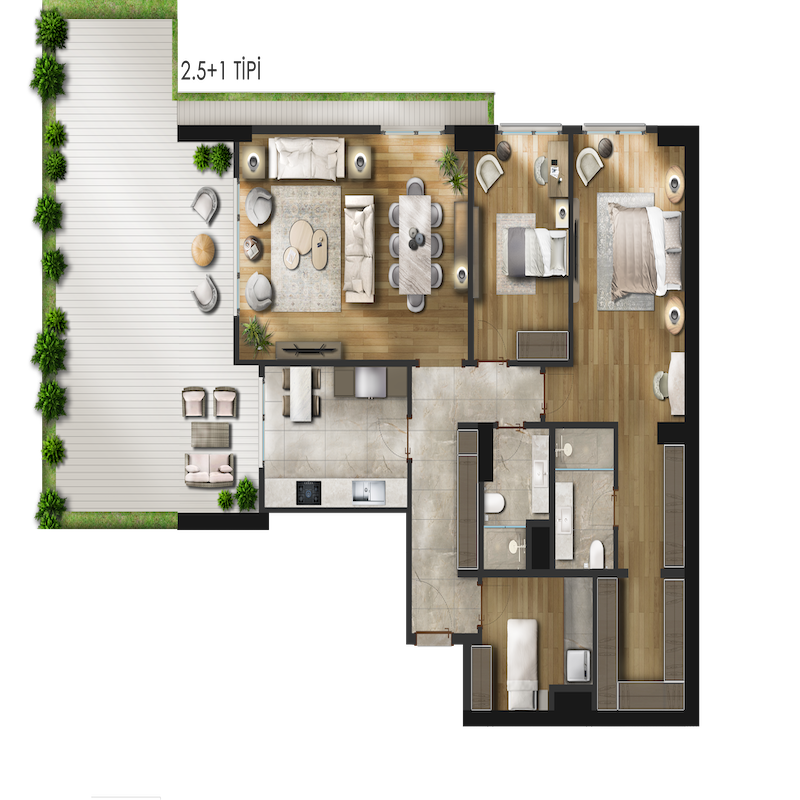From 2.5 + 1 to 5.5 + 2. There are duplexes options as well as the garden option with areas starting from 131 square meters to 549 square meters, you can choose the most comfortable for your family!