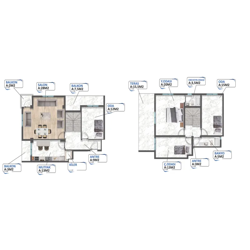 The project was built on a land area of 8300 square meters, and it consists of 5 residential buildings with a height of 6 floors, so that the number of residential properties in it is 148 apartments offered for sale in Izmit, in which there are options starting from 2 + 1 to 5 + 1, with spaces starting from 95 to 256 square meters, there are different styles and different types of apartments to suit everyone.