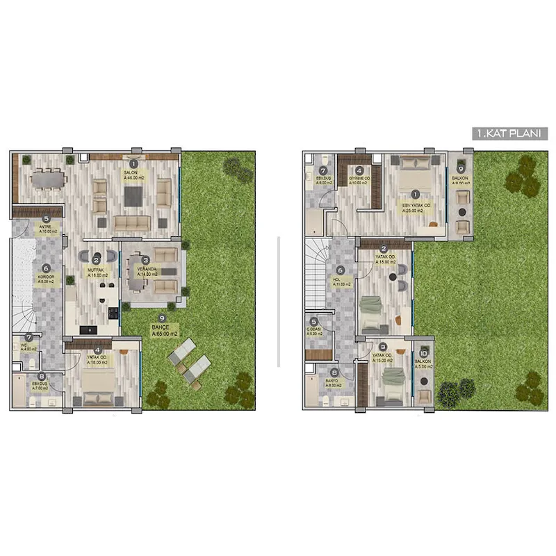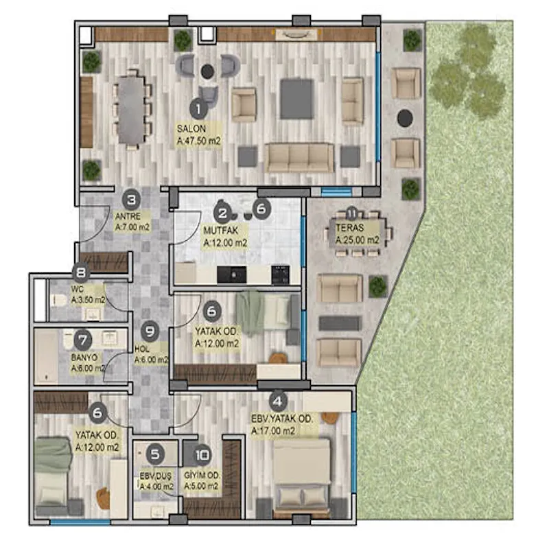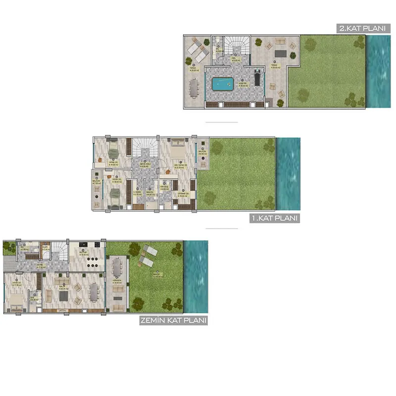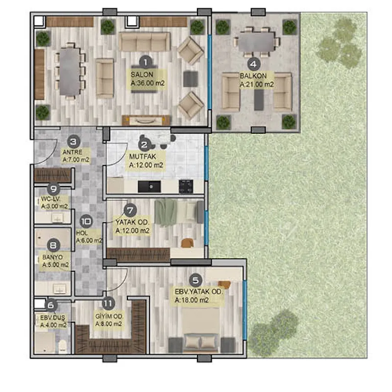 Проект был построен на территории площадью 30 800 квадратных метров и состоит из 16 жилых блоков высотой в 4 этажа, так что общее количество квартир в нем составляет 207 квартир на продажу в Турции. В настоящее время на продажу выставлены варианты квартир от 2+1 до 4+2. Площадью от 195 до 485 квадратных метров.