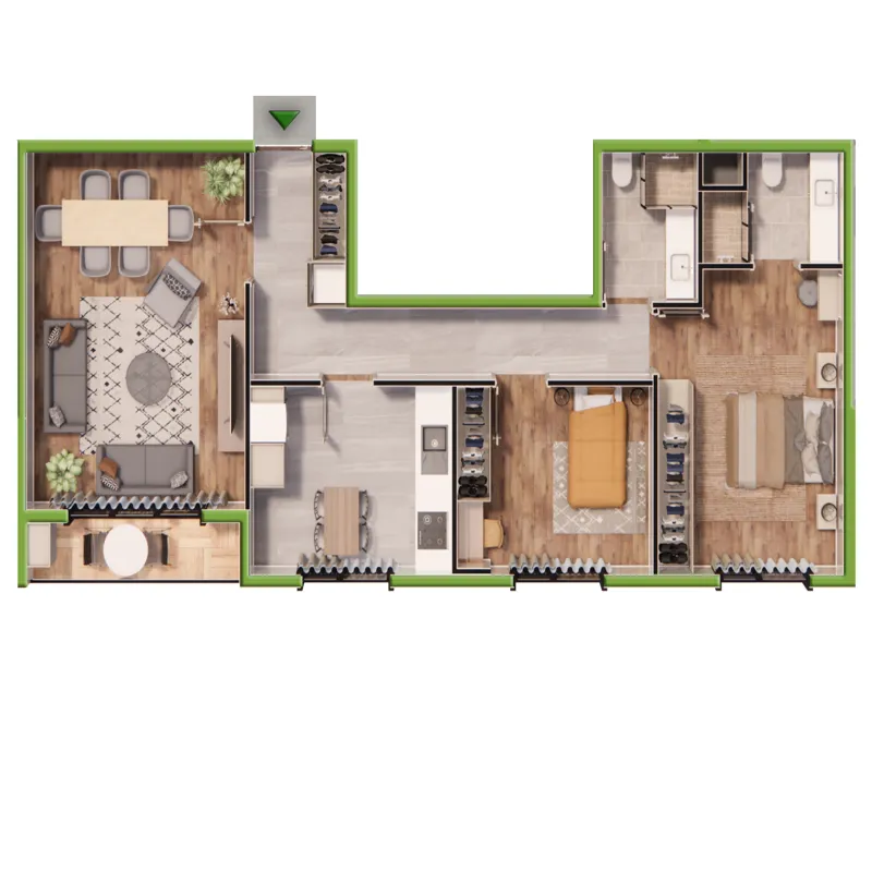 Bu projenin kuleleri 4500 metrekarelik bir arazi alanı üzerine inşa edilmiş olup, her bina için 13 kat yüksekliğinde 2 bina veya konut bloğundan oluşmaktadır, böylece içindeki toplam daire sayısı 156 konuttur ve şu anda 1 + 1'den başlayarak 3 +1'e kadar gayrimenkul seçenekleri vardır ve alanlar 72 metrekareden 167 metrekareye kadar başlar.