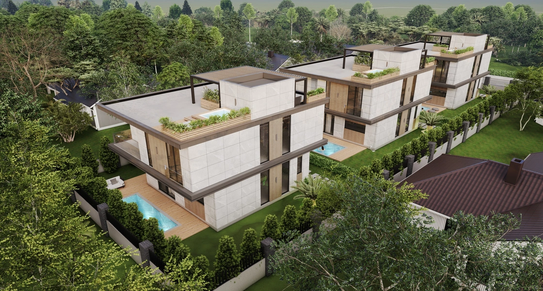 Huzur ve mutlak mahremiyetin tadını çıkarmanıza olanak tanıyan, 1117 metrekarelik geniş bir arsa üzerinde yer alan, her biri bağımsız bir mimari mücevher olan üç bağımsız villa sunuyoruz.