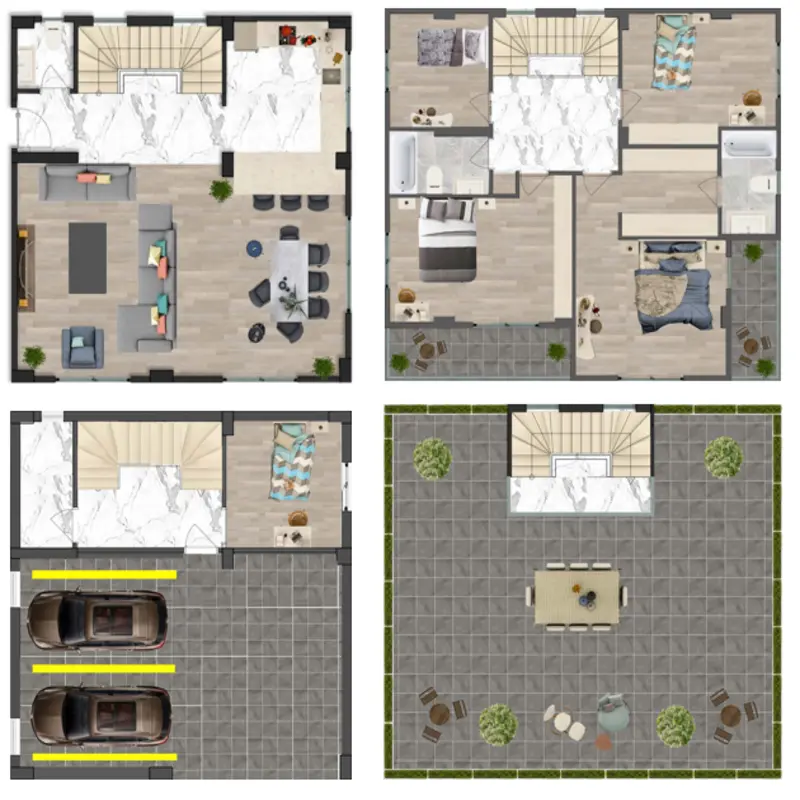 - Birinci Kat (125 metrekare): Mahremiyet ve konfor sağlamak için her biri özel en-suite banyo ile donatılmış 4 geniş yatak odası.